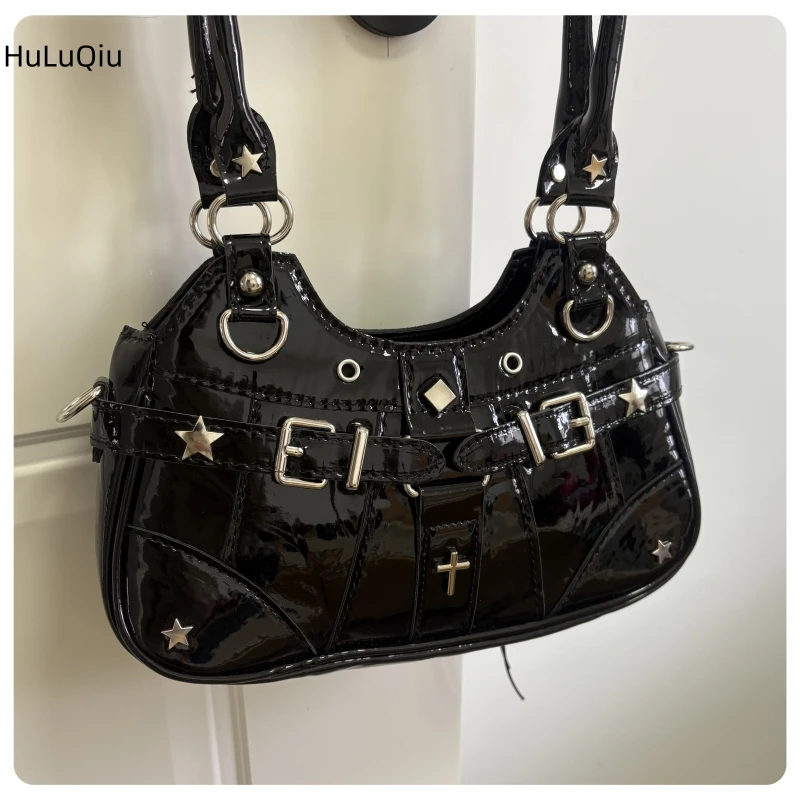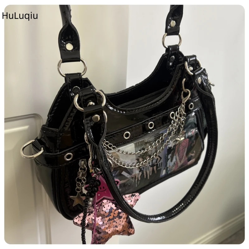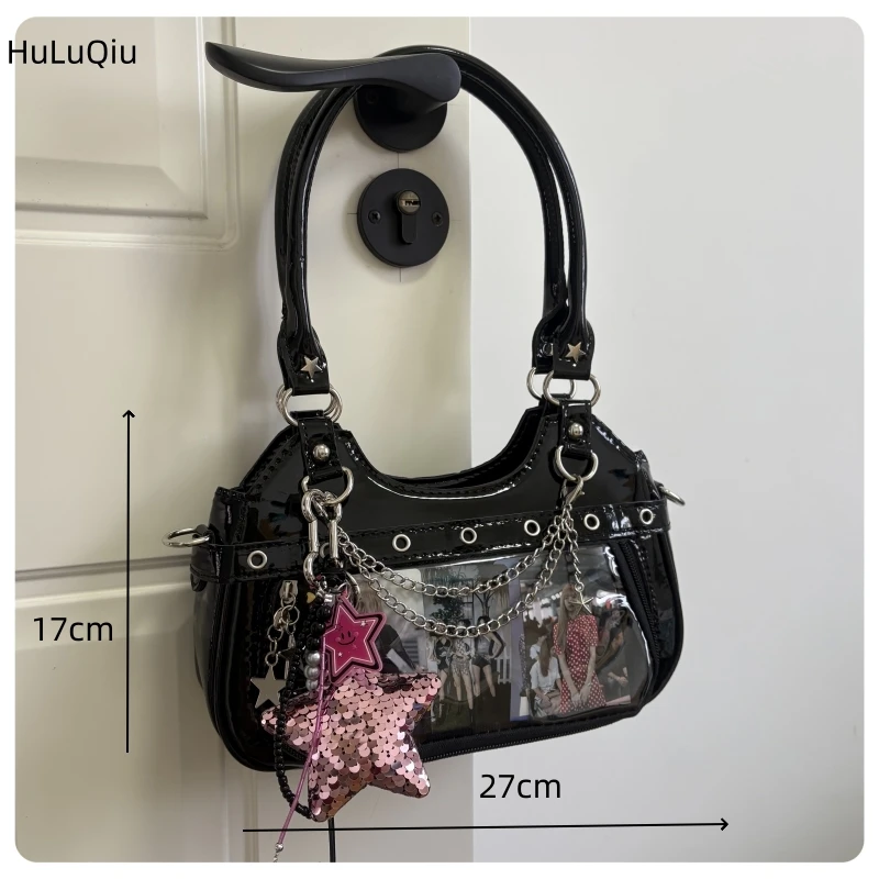 Keywords: punk ita bag, gothic ita shoulder bag, Harajuku style purse, clear anime display bag, emo aesthetic bag, star charm chain bag, kawaii goth purse, black patent handbag, customizable ita crossbody, edgy mini shoulder bag.