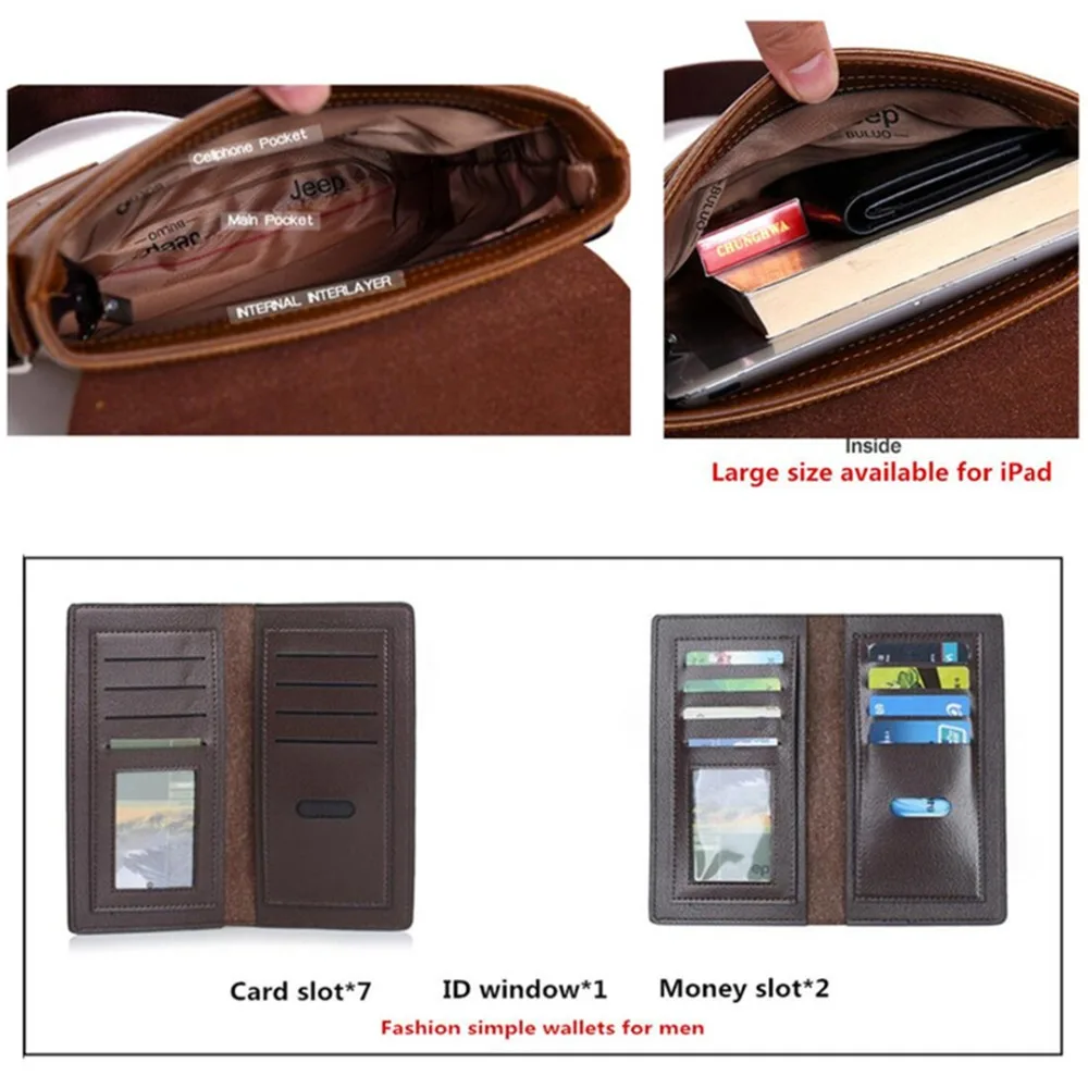 Keywords: men’s leather crossbody bag, Jeep Buluo messenger bag, PU leather shoulder bag, men’s bag with wallet, everyday office bag, iPad bag for men, casual leather satchel, business crossbody bag, wallet and bag set for men, functional men’s messenger bag