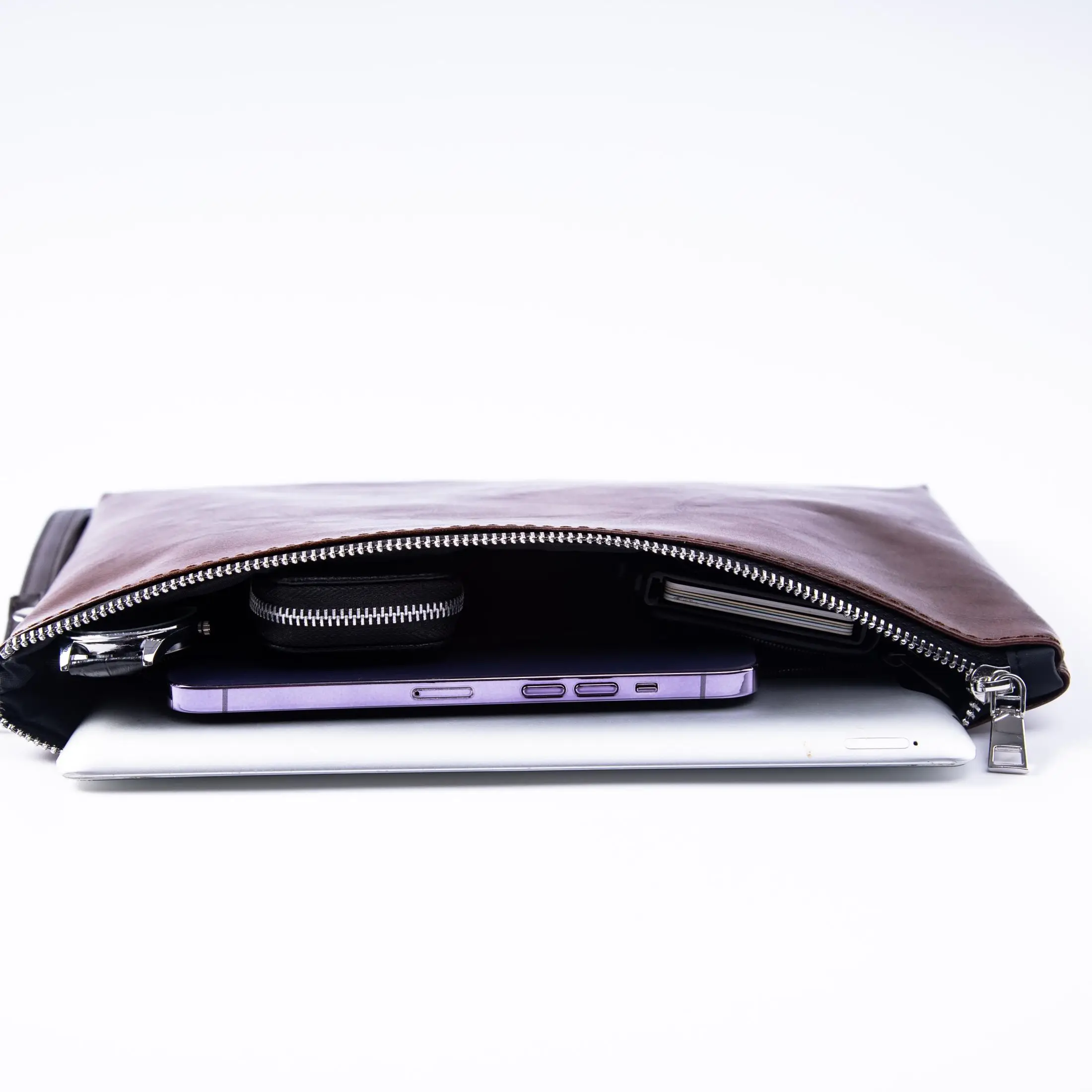 Keep your work essentials sharp and organized with this sleek men’s leather document holder. Crafted from smooth, high-quality leather in a classic deep brown finish, this slim portfolio clutch is perfect for carrying documents, tablets, business cards, and pens in polished style.
