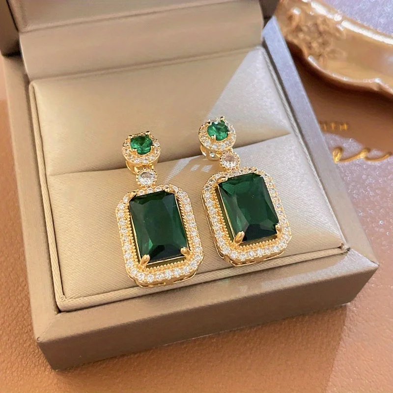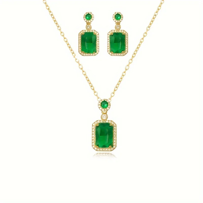 Channel vintage royalty with this classic pendant necklace and drop earrings set, featuring a radiant emerald-cut gemstone framed in sparkling pavé stones. With a regal rectangular drop design and delicate gold-tone chain, this set offers timeless sophistication for formal events, weddings, or romantic evenings.