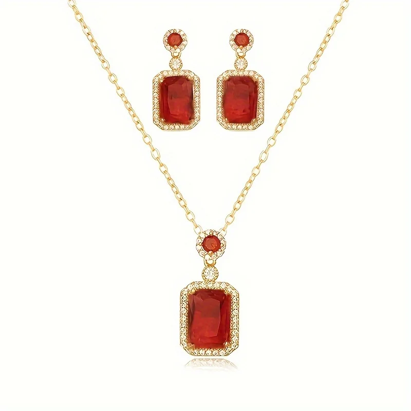 Keywords: emerald pendant set, ruby jewelry set, vintage gold necklace earrings, gemstone bridal jewelry, evening jewelry for women, emerald drop earrings, red stone necklace set, formal jewelry accessories